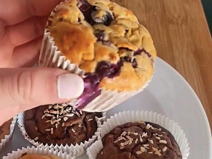 Protein powder increases the protein content and makes the muffins more filling.